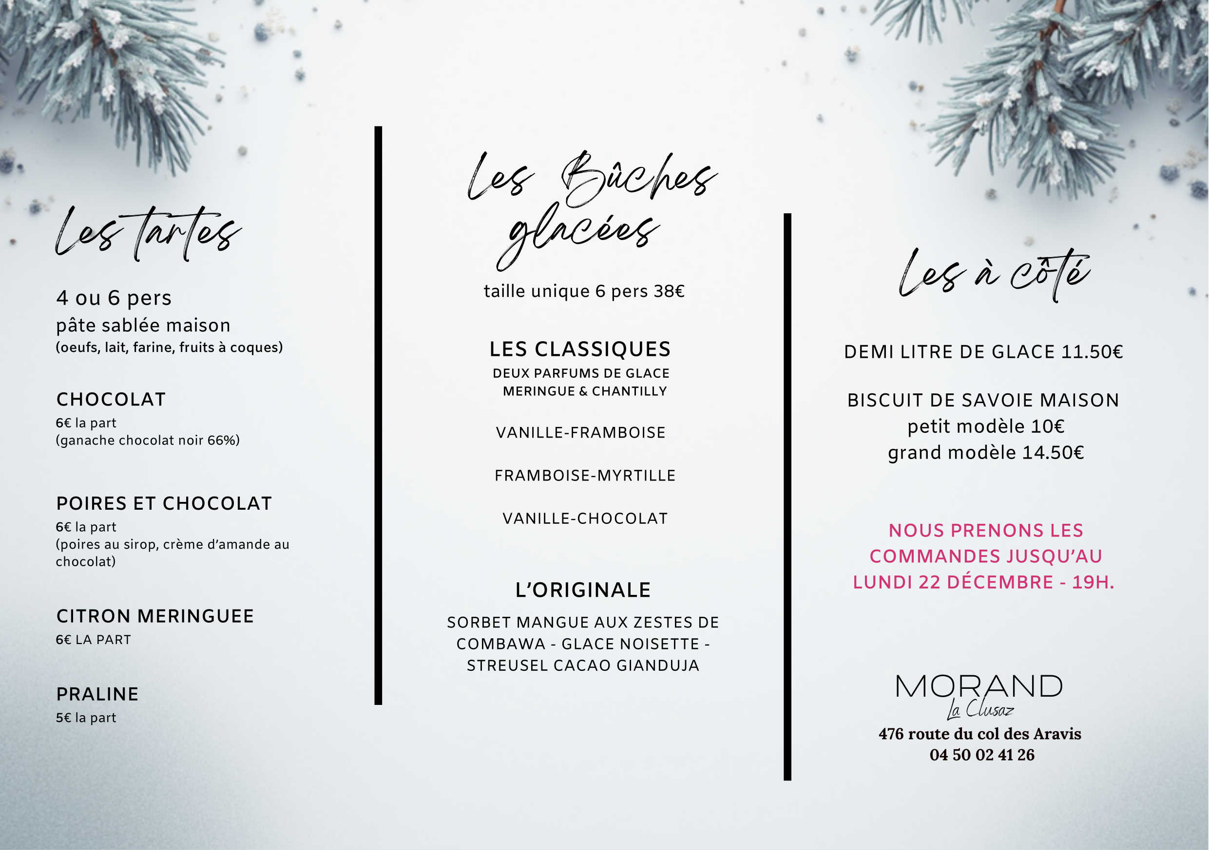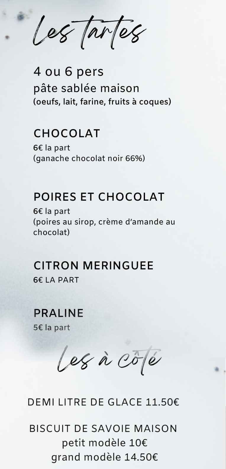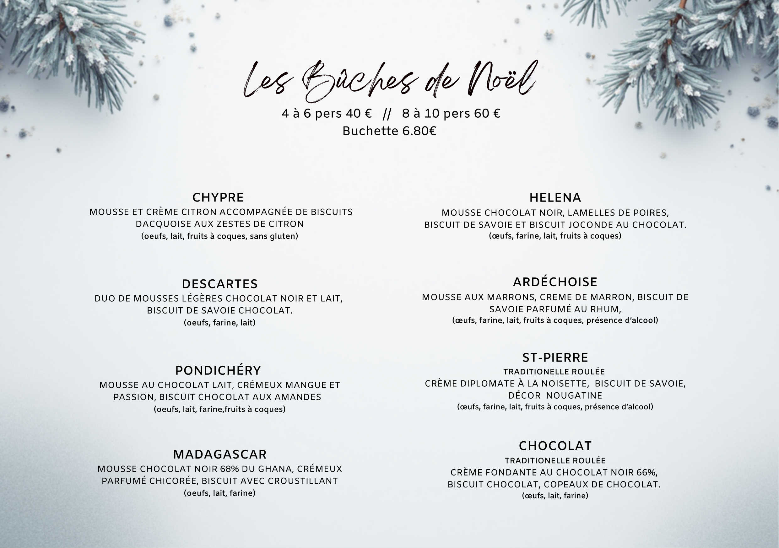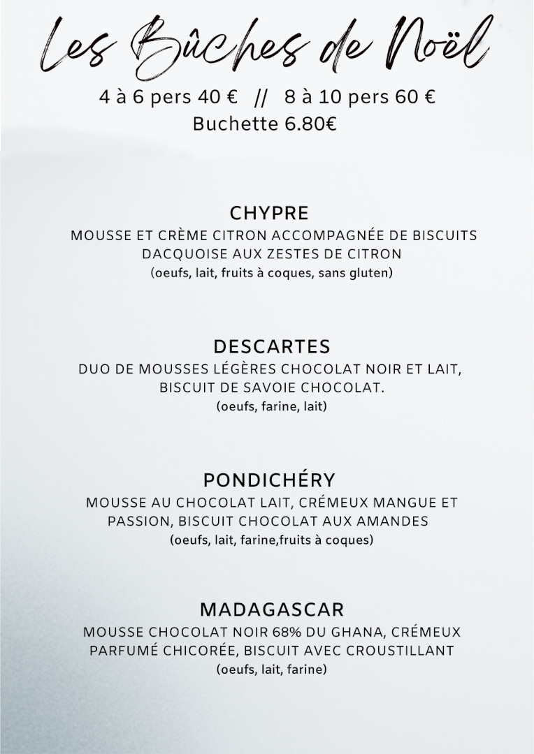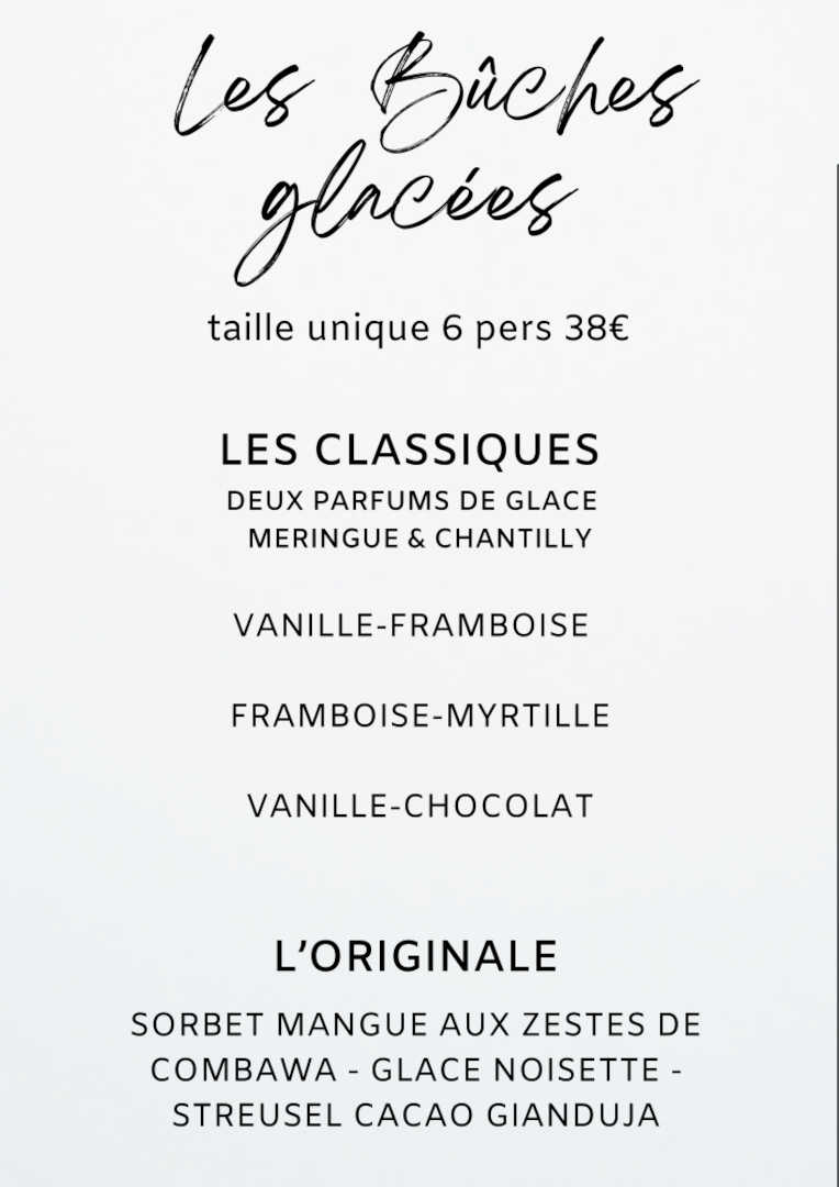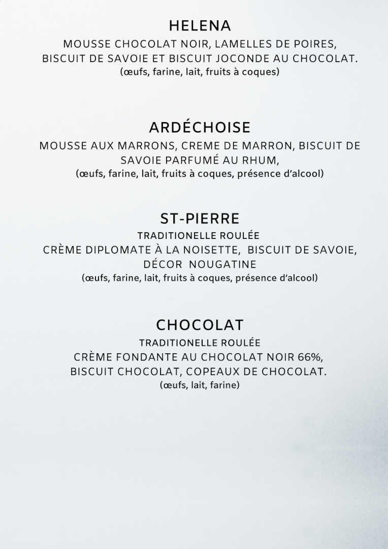 Carte des desserts BUCHES DE NOEL Bûche pour 4 à 6 personnes 40 € Bûche pour 8 à 10 personnes 60 €Bûchette individuelle 6.80€CHYPRE MOUSSE ET CRÊME CITRON ACCOMPAGNÉE DE BISCUITS DACQUOISE AUX ZESTES DE CITRON (contient: oeufs, lait, fruits à coques, sans gluten)DESCARTES DUO DE MOUSSES LÉGÈRES CHOCOLAT NOIR ET LAIT, BISCUIT DE SAVOIE CHOCOLAT. (contient: oeufs, farine, lait)PONDICHERYMOUSSE CHOCOLAT LAIT, CRÉMEUX MANGUE ET PASSION, BISCUIT CHOCOLAT AUX AMANDES (contient: oeufs, farine, lait) MADAGASCAR MOUSSE CHOCOLAT NOIR 68% DU GHANA, CRÉMEUX PARFUMÉ CHICORÉE, BISCUIT CROUSTILLANT.(contient: œufs, lait, farine) HELENA MOUSSE CHOCOLAT NOIR, LAMELLES DE POIRES, BISCUIT DE SAVOIE ET BISCUIT JOCONDE AU CHOCOLAT. (contient: œufs, farine, lait, fruits à coques) ARDECHOISE MOUSSE AUX MARRONS, CREME DE MARRON, BISCUIT DE SAVOIE PARFUMÉ AU RHUM. (contient: œufs, farine, lait, fruits à coques) ST-PIERRE TRADITIONELLE ROULÉE CRÈME DIPLOMATE À LA NOISETTE, BISCUIT DE SAVOIE, DÉCOR NOUGATINE. (contient: œufs, farine, lait, fruits à coques, kirsch) CHOCOLAT TRADITIONELLE ROULÉE CREME FONDANTE AU CHOCOLAT NOIR 66%, BISCUIT CHOCOLAT, COPEAUX DE CHOCOLAT.(contient: oeufs, lait, farine) BUCHES GLACEES TAILLE UNIQUE 4-6 PERS 38€ CLASSIQUE DEUX PARFUMS DE GLACE MERINGUE FRANÇAISE ET CHANTILLY : VANILLE-FRAMBOISE FRAMBOISE-MYRTILLE VANILLE-CHOCOLAT ORIGINAL : SORBET MANGUE AUX ZESTES DE COMBAWA, GLACE NOISETTE, STREUSEL CACAO GIANDUJA TARTES PÂTE SABLÉE MAISON (contient: oeufs, farine, lait, fruits à coques) TAILLE 4 ou 6 pers CHOCOLAT (ganache chocolat noir 66%) 6€ la part POIRES ET CHOCOLAT ( poires au sirop et crème d’amande au chocolat) 6€ la part CITRON MERINGUÉE 6€ la part PRALINE 5€ la part LES à CÖTÉ DEMI LITRE DE GLACE 11.5€ VANILLE - CHOCOLAT - CAFE - PISTACHE - NOISETTE FRAMBOISE - CITRON - MYRTILLE - MANGUE BISCUIT DE SAVOIE MAISON PETIT MODELE 10€ GRAND MODELE 14.50€